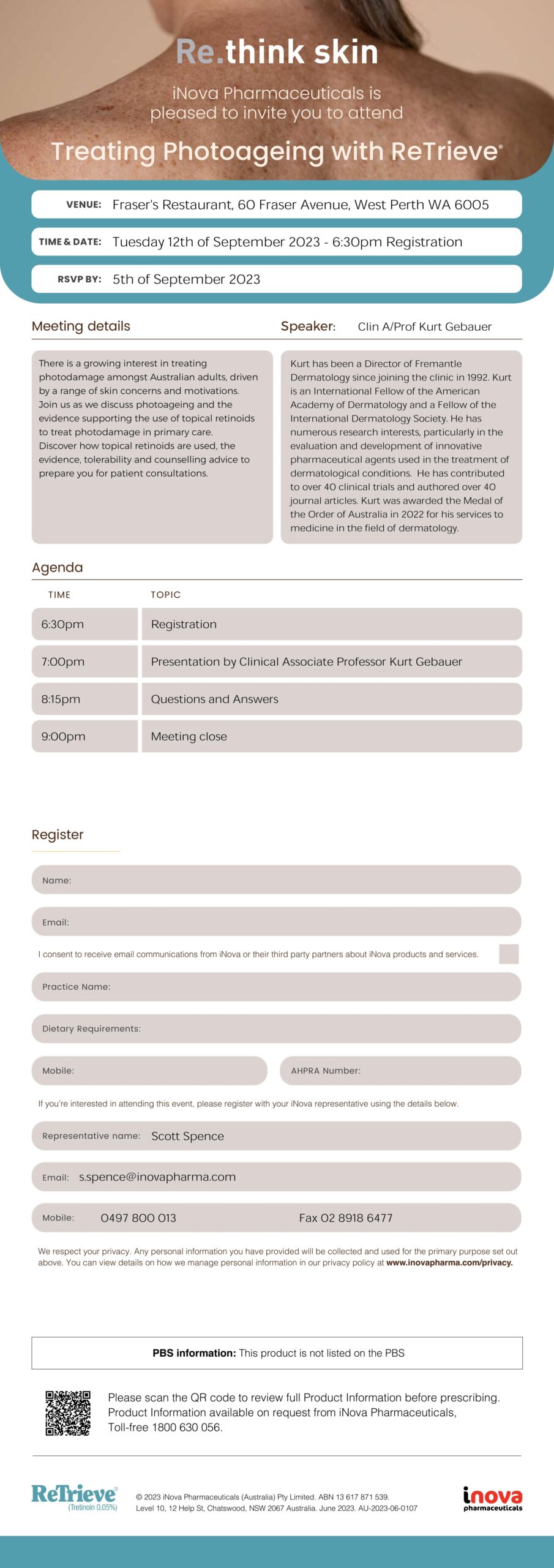 September 12, 2023 @ September 12, 2023 - September 12, 2023 Treating Photoageing Fraser’s Kings Park 60 Fraser Ave, West Perth Free