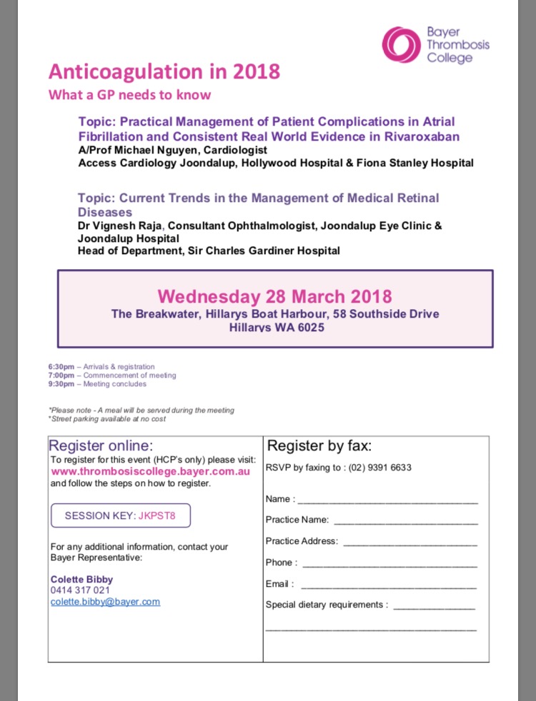 The Breakwater @ Hillarys Boat Harbour 58 Southside Drive, Hillarys WA, WA, AustraliaTopic 1: Practical management of patient complications in Atrial Fibrillation with Cardiologist A/Prof Michael Nguyen Topic 2: Current trends in the management of Medical Retinal Diseases with Ophthalmologist Dr Vignesh Raja