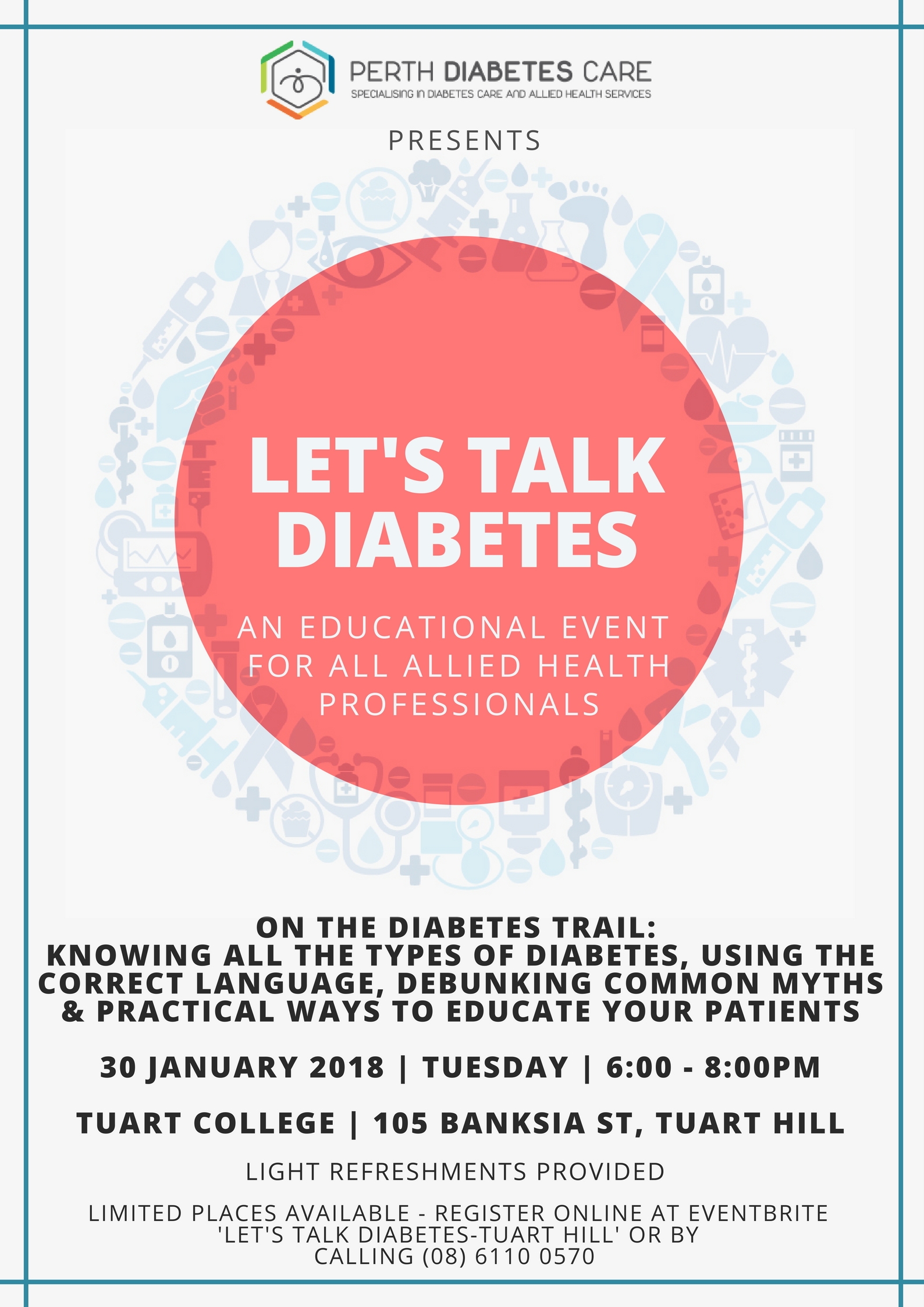 Tuart College 105 Banksia St, Tuart Hill, WA, AustraliaOur seminars were so well received in 2017, that Perth Diabetes Care is back for 2018 with FREE Allied Health Professional seminars. Diabetes is a strenuous disease for not only the person who lives with it; numerous people are involved in the management. Hence, our first seminar will look into the basics of diabetes, discuss…