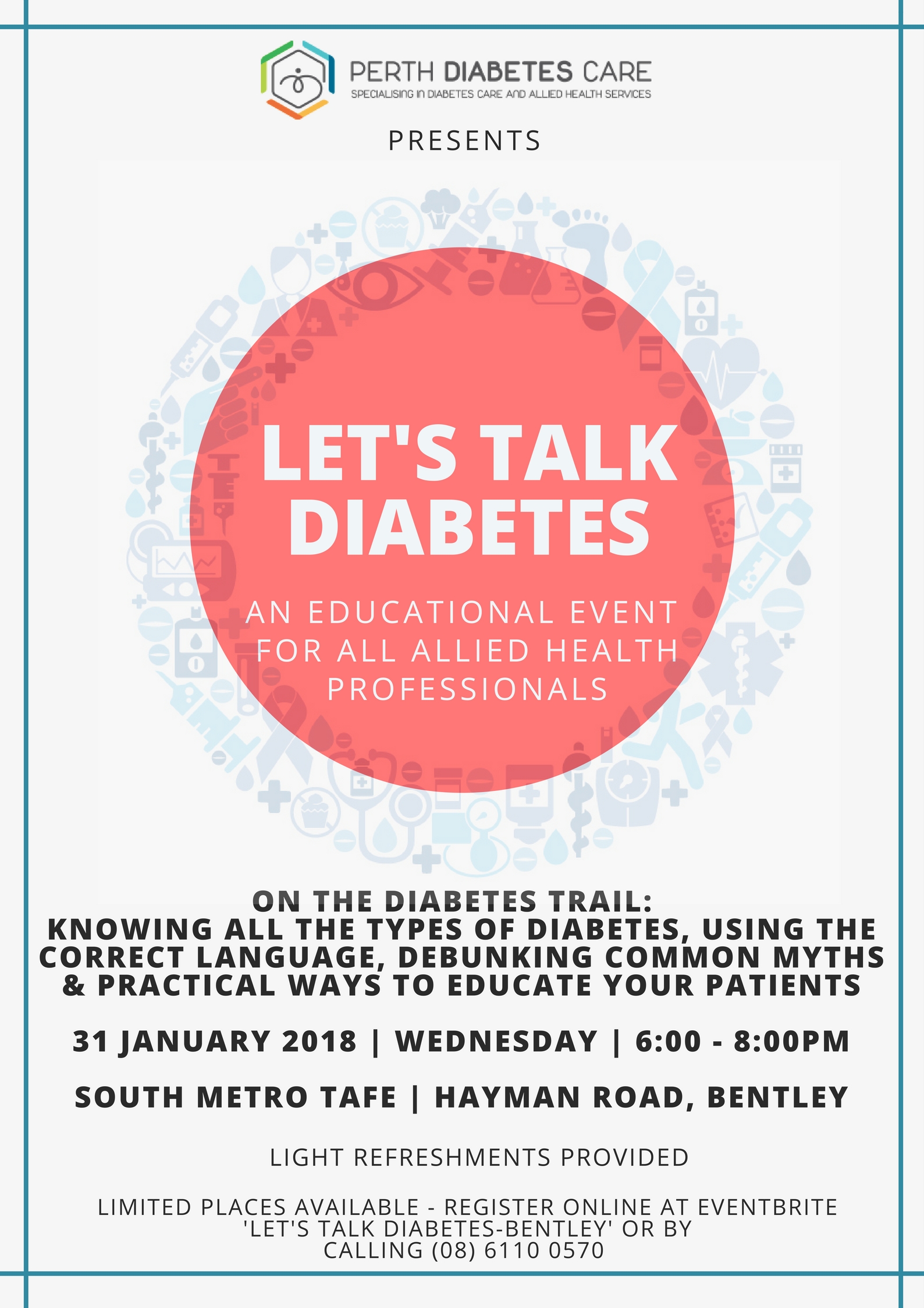 South Metro TAFE Hayman Road, Bentley, WA, AustraliaOur seminars were so well received in 2017, that Perth Diabetes Care is back for 2018 with FREE Allied Health Professional seminars. Diabetes is a strenuous disease for not only the person who lives with it; numerous people are involved in the management. Hence, our first seminar will look into the basics of diabetes, discuss…