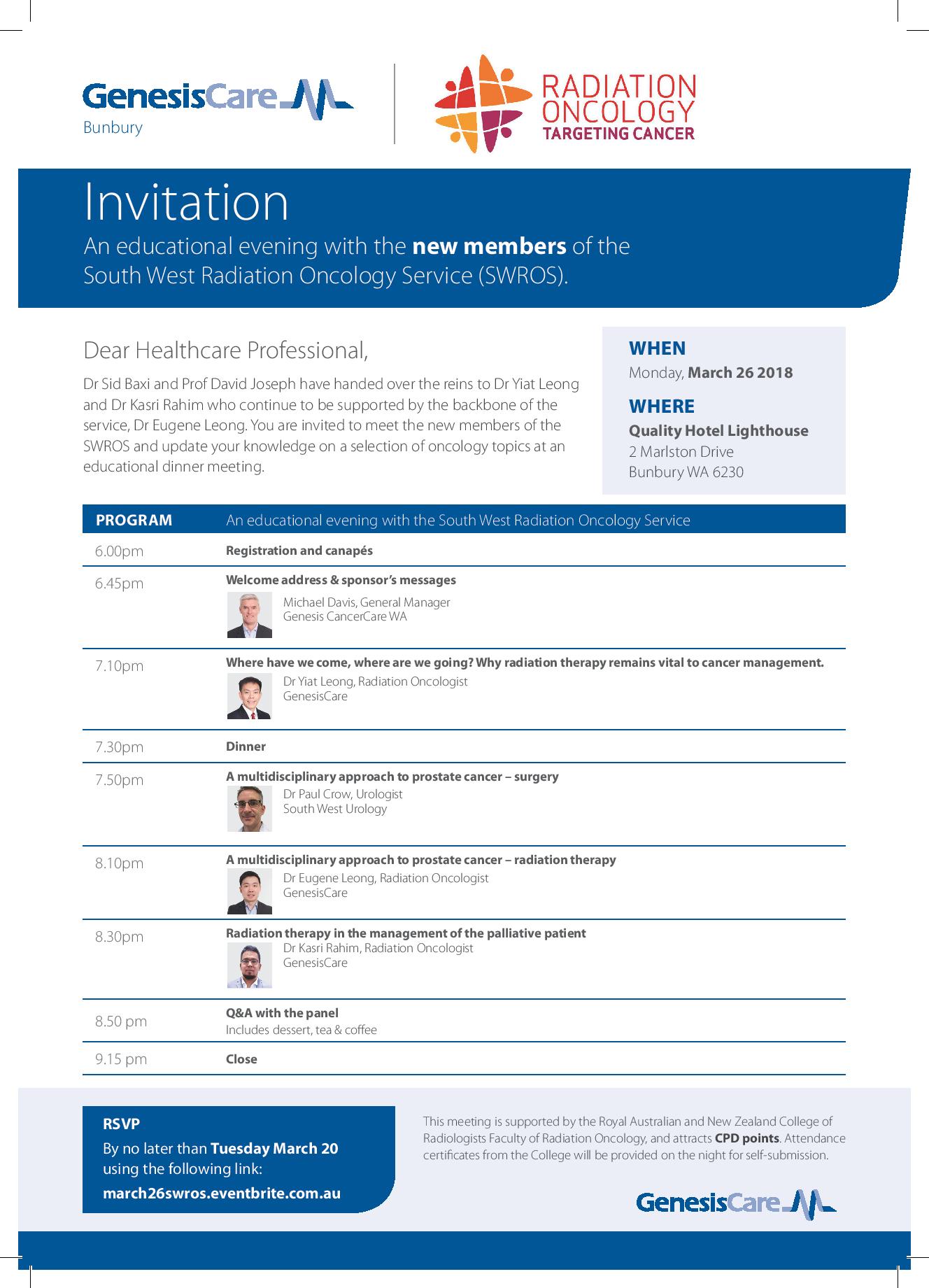 Quality Hotel Lighthouse 2 Marlston Drive, Bunbury, WA, AustraliaDear Healthcare Professional, Dr Sid Baxi and Prof David Joseph have handed over the reins to Dr Yiat Leong and Dr Kasri Rahim who continue to be supported by the backbone of the service, Dr Eugene Leong. You are invited to meet the current and new members of the South West Radiation Oncology Service (SWROS)…