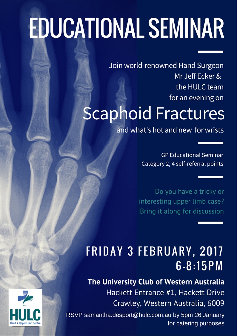UWA: Want to know the latest techniques in surgery and hand therapy for scaphoid fractures and wrists, whilst earning 4 self referral category 2 points? Attend one of our interactive Educational Seminars; 27 January at HULC Bunbury, 3 February University Club of WA. Bring along your tricky or interesting upper limb case studies for discussion.…