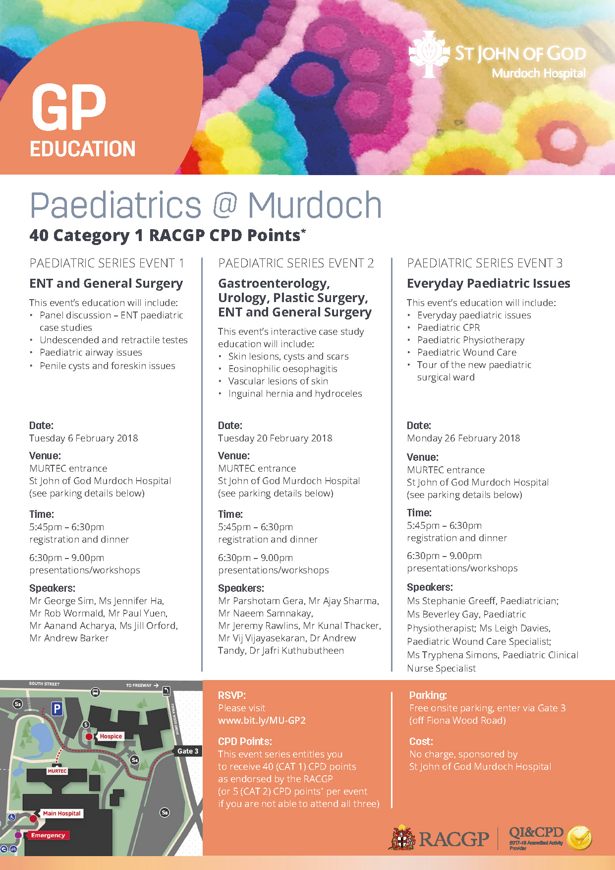 St John of God - Murdoch 100 Murdoch Dr, Murdoch WA 6150, WA, AustraliaThe 2018 St John of God Murdoch Hospital GP Education Program Paediatrics @ Murdoch Series (ALM): Event 1 – ENT and General Surgery Speakers Mr George Sim - ENT specialist…