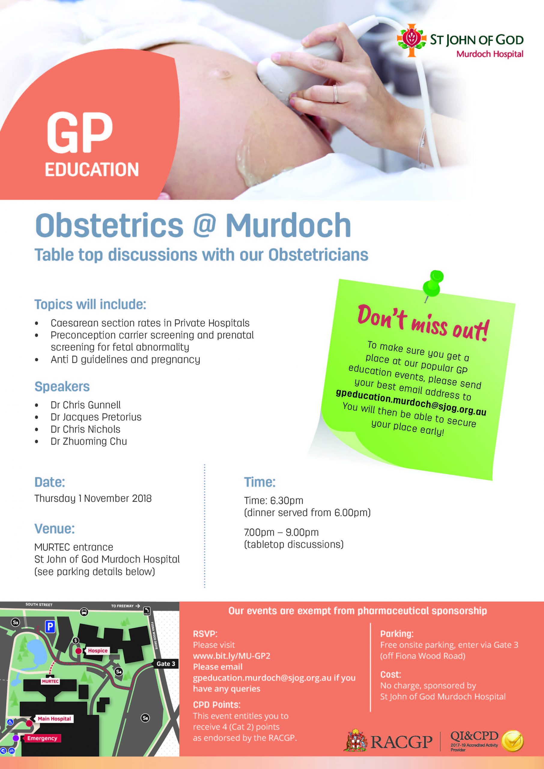 St John of God - Murdoch 100 Murdoch Dr, Murdoch WA 6150, WA, AustraliaObstetrics @ Murdoch Education from 7.00pm sharp Table top discussions with our Obstetricians Topics will include: • Casearean section rates in Private Hospitals • Preconception carrier screening and prenatal screening…