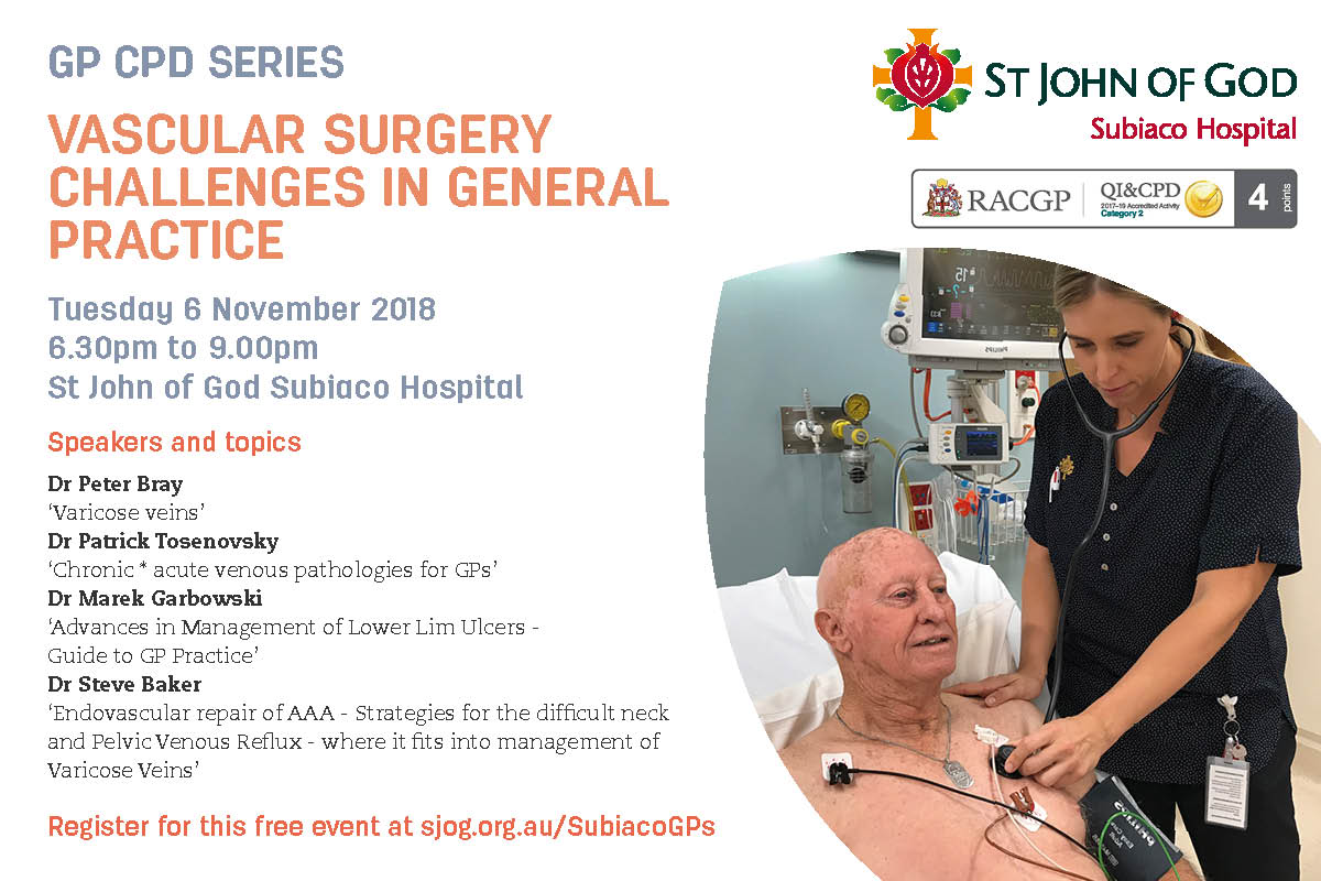 St John of God Subiaco Hospital, Conference Centre 25 McCourt Street, Subiaco, WA, AustraliaSt John of God Subiaco Hospital invites General Practitioners to our evening education session on Vascular Surgery Challenges in General Practice. Director GP Liaison, Dr Erin Horsley, has brought together…