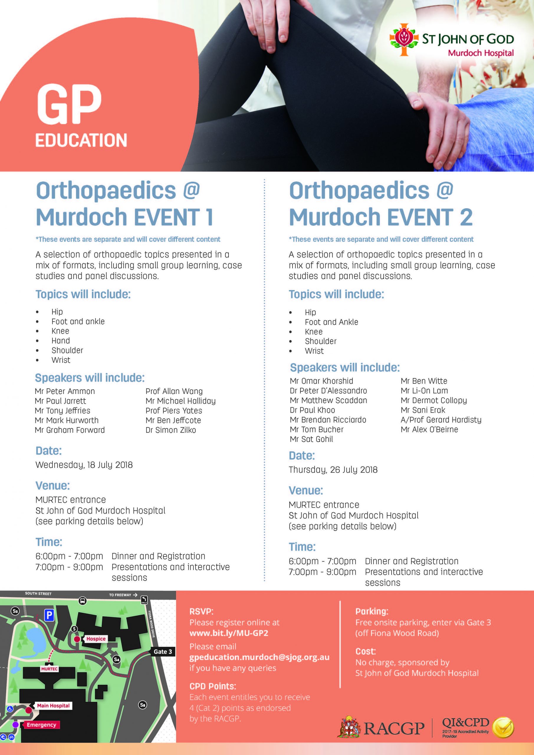 St John of God - Murdoch 100 Murdoch Dr, Murdoch WA 6150, WA, AustraliaTopics include: • Orthobiologics in treating osteoarthritis • Recognising common non arthritic causes of hip pain • Common sporting injuries of the knee ligament • Hip examination • Management of…