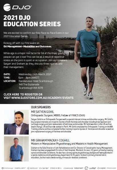 You are invited to attend the first DJO event in 2021, OA Management- Modalities and Outcomes. Orthopaedic surgeon, Mr.Gohil and physiotherapist, Mr. Graham Mackay-Coghill will be presenting a comprehensive discussion on the management of knee injuries, in particular, osteoarthritis.