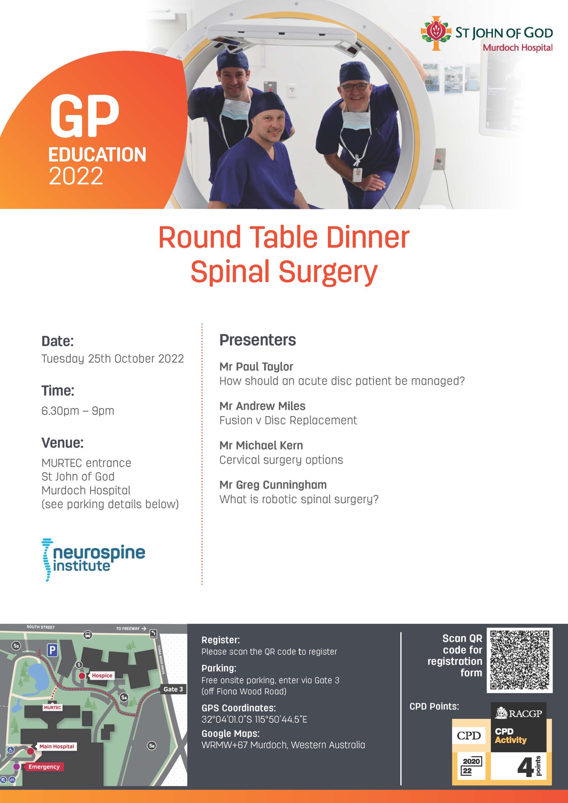 October 25, 2022 @ October 25, 2022 - October 25, 2022 Round Table Dinner – Spinal Neurosurgery St John of God - Murdoch 100 Murdoch Dr, Murdoch WA 6150, WA, Australia Free