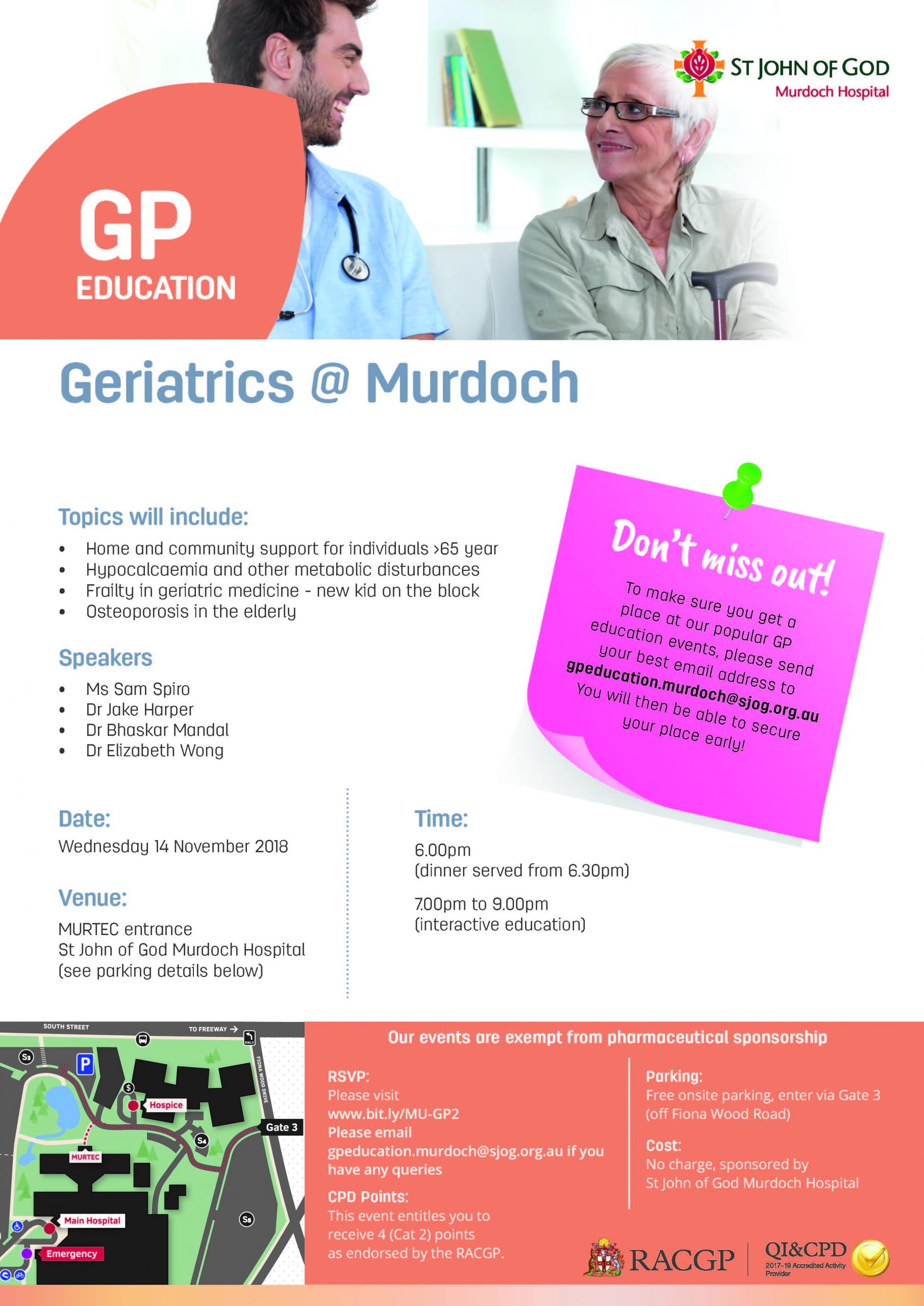 St John of God - Murdoch 100 Murdoch Dr, Murdoch WA 6150, WA, AustraliaEducation from 7.00pm sharp Ms Sam Spiro - Home and Community Support for Individuals >65yrs Dr - Jake Harper - Hypocalcaemia and other metabolic disturbances Dr Elizabeth Wong - Osteoporosis…