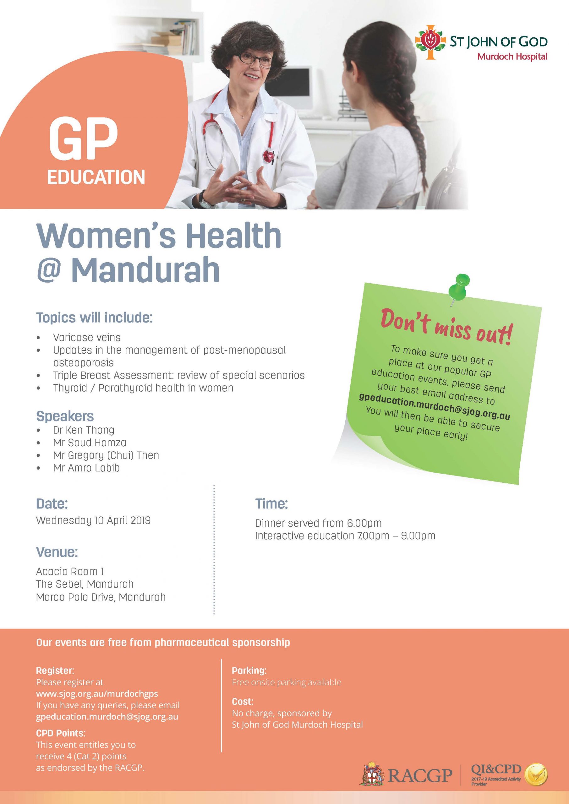 This event will be held in Mandurah and presented by specialists who consult locally at the St John of God Mandurah Consulting Suites. Topics will include: • Varicose veins •…
