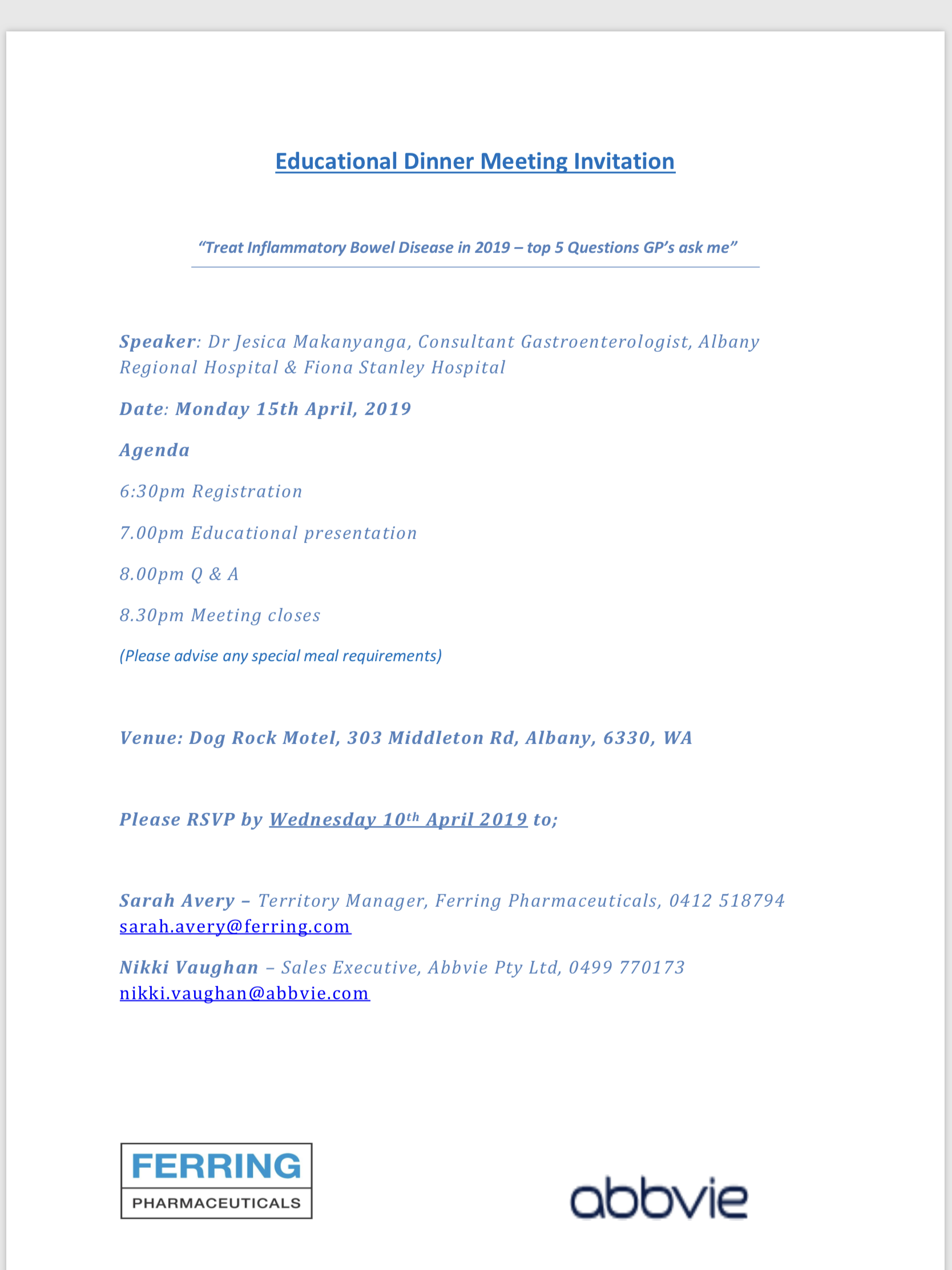 GP Educational Dinner “Treating Inflammatory Bowel Disease in 2019 - the top 5 questions GP’s ask me”. Presenter Dr Jesica Makanyanga from Albany Regional Hospital and Fiona Stanley Hospital, Perth.…