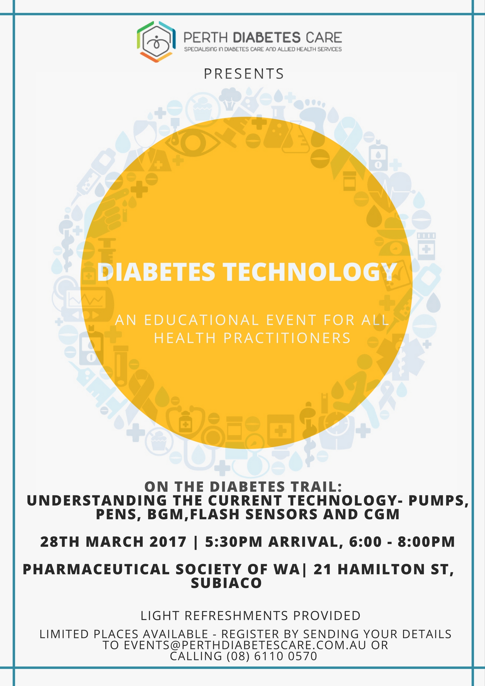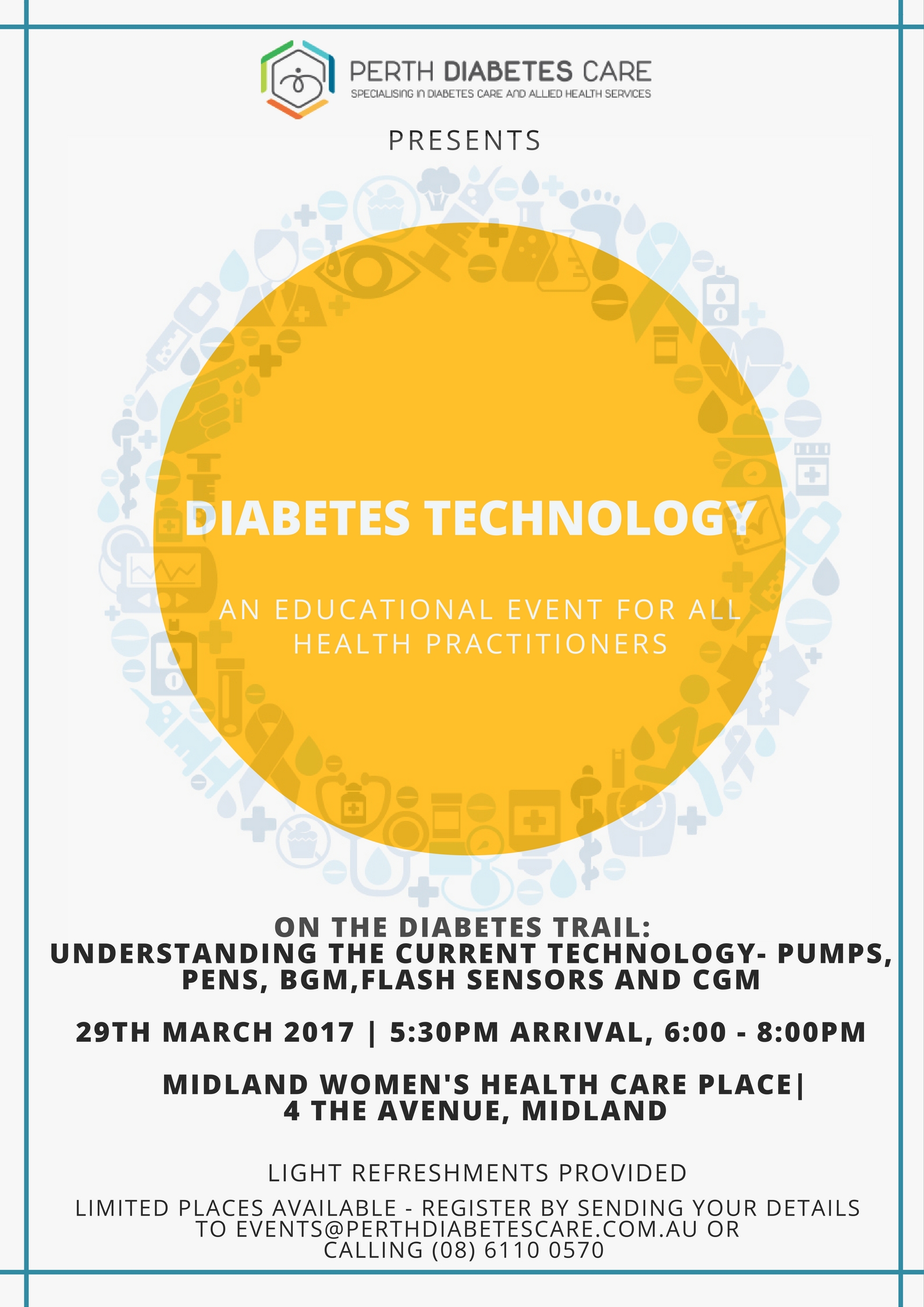 This Health Care Professional event will take you through the process of understanding the current diabetes technology available in Australia- Pumps, Flash Sensors and Continuous Glucose Monitors. Come join Perth Diabetes Care, as they take you through this all important topic, with the added bonuses of a hands on workshop plus having your questions answered…