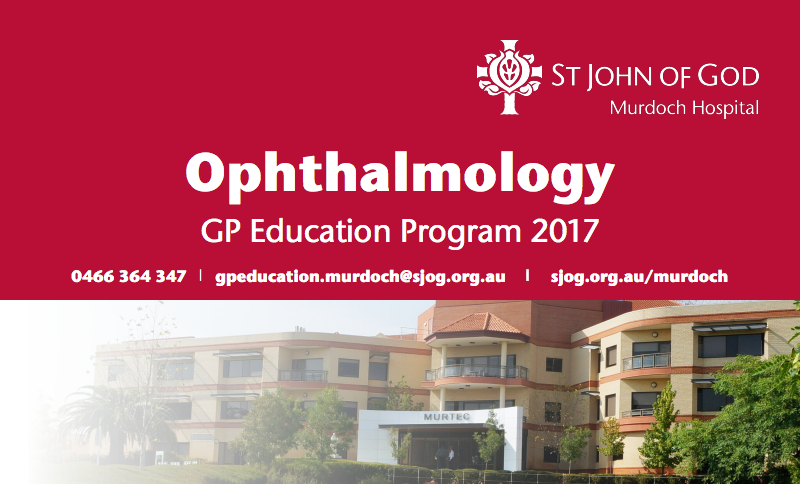 Speaker Jason Lim – Ophthalmologist Murdoch Ophthalmology Eye Specialists Topics: 1. Different investigative modalities (particularly for AMD and diabetic retinopathy patients) that a patient may undergo in an ophthalmology visit 2. An update on the management of glaucoma 3. An update on the surgical management of cataracts Please submit any ophthalmological patient questions or cases…