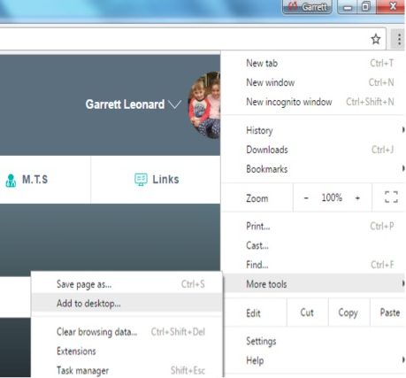 To Download GPHQ to your desktop in Google Chrome, click the icon at the top right corner of your screen as shown below. Scroll to “More Tools” and then “Add to Desktop”. Then click “save” and the GPHQ icon will appear on your desktop. GPHQ performs best in Google Chrome.